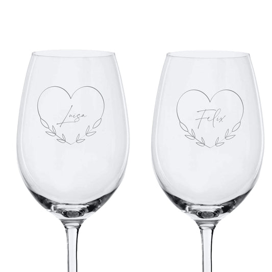 Weinglas Set Herz mit Blumenranke und Wunschtext